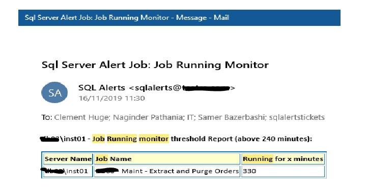 - AlertWhenRunningMoreThan field enables the monitor to send an alert when the job has been running for more than X minutes. In my experience, I have seen jobs that usually takes seconds bein locked and run minutes to hours and even days. This helped the DBA/Devops to be alerted on jobs that are running abnormally a long time and prevent catastrophic issues.